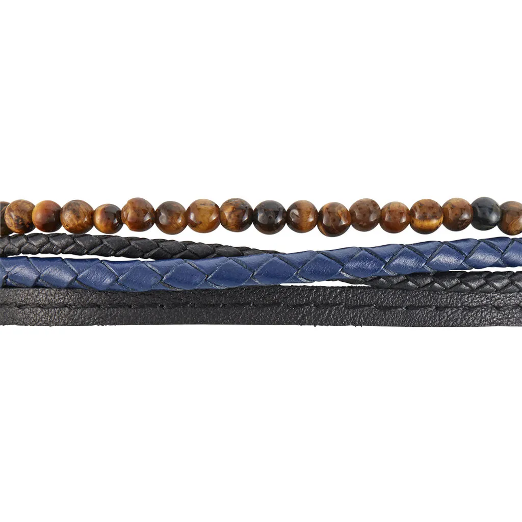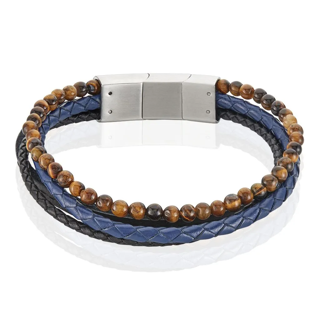 Bracelet Acier Blanc Multirangs Cuir De Vache Noir Et Boules œil De Tigre 21cm