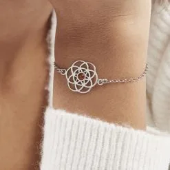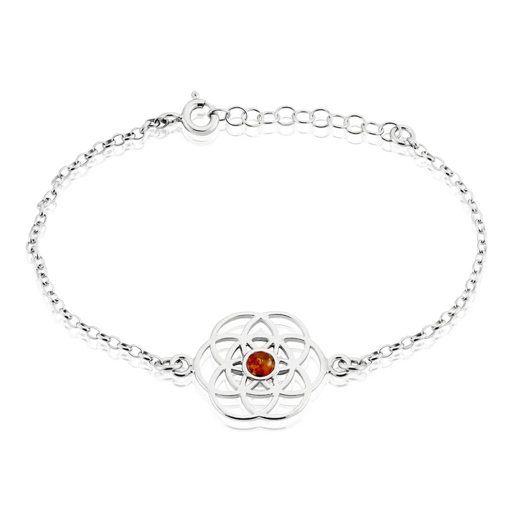 Bracelet Argent Blanc 925/1000 Fleur De Vie Ambre Cognac Maille Forçat 19cm