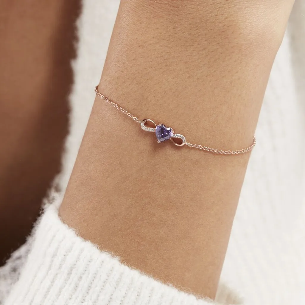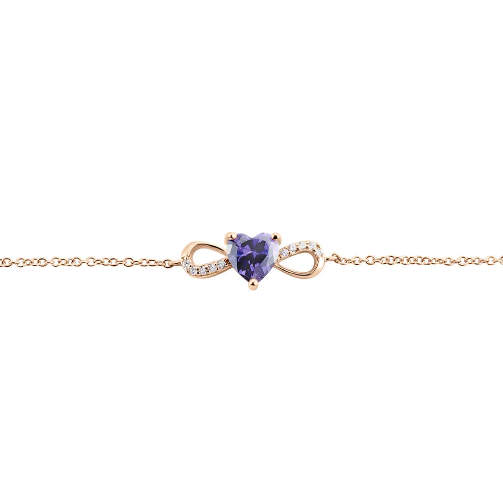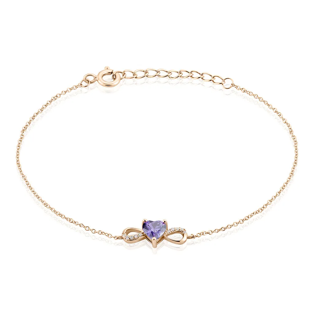 Bracelet Argent Rose 925/1000 Cœur Serti Griffes Oxyde De Zirconium Violet Accompagné Maille Forçat 19cm
