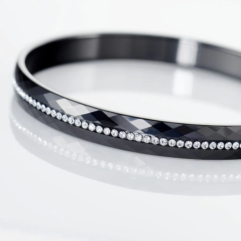 Bracelet Jonc Ceramique Facettee Noire Rang Pierres Blanches 6mm