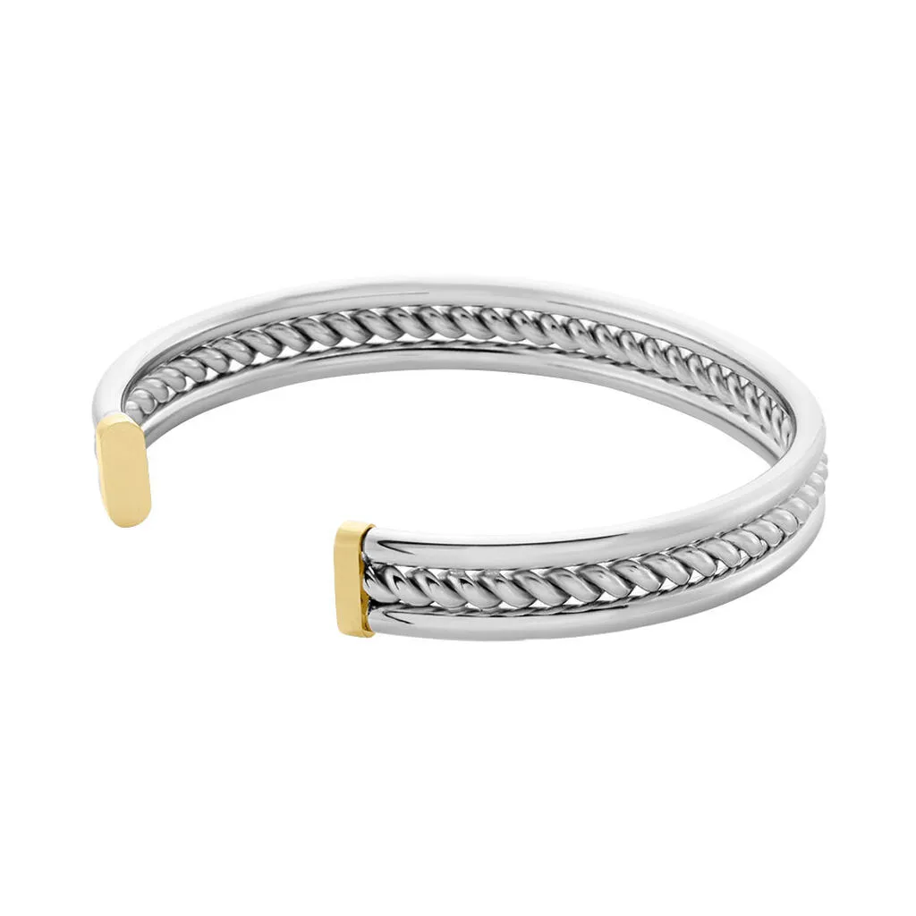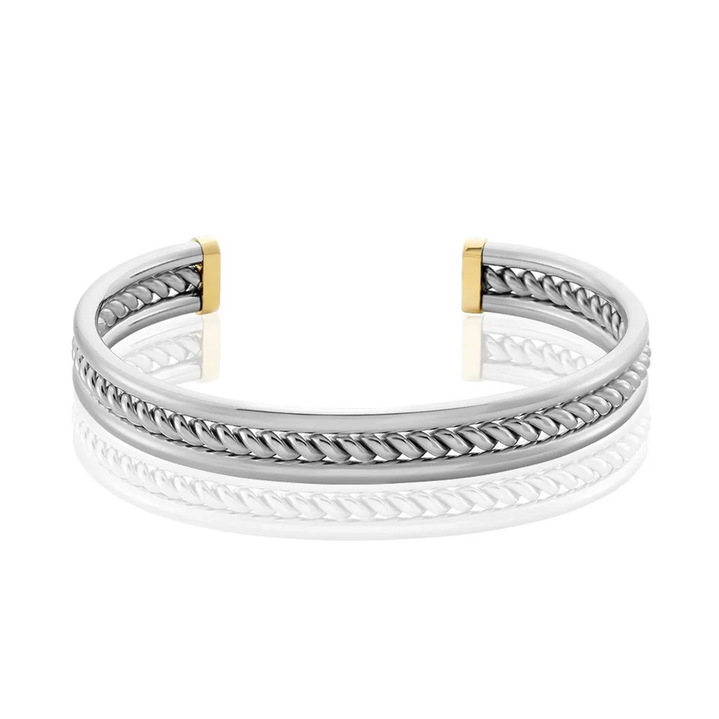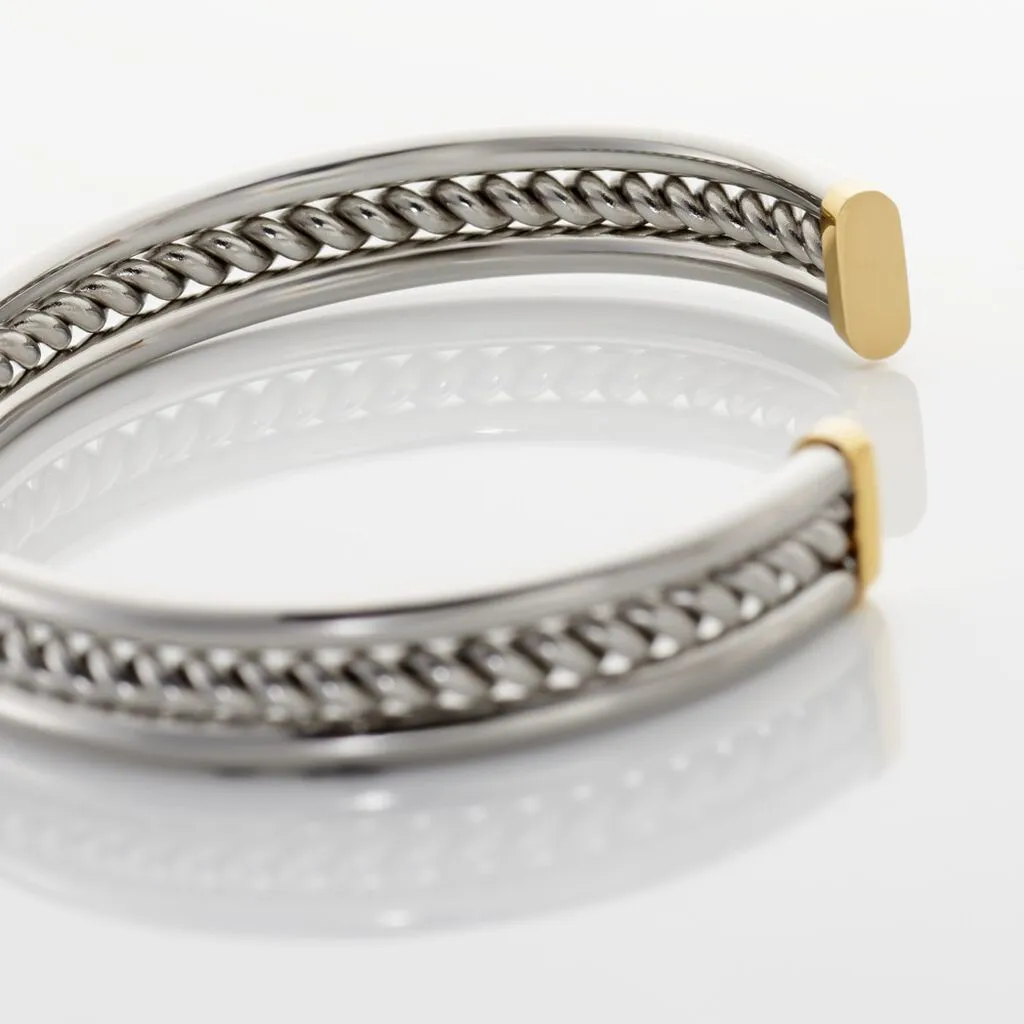 Bracelet Jonc Ouvert Acier Blanc Effet Tresse Embouts Dores 60mm