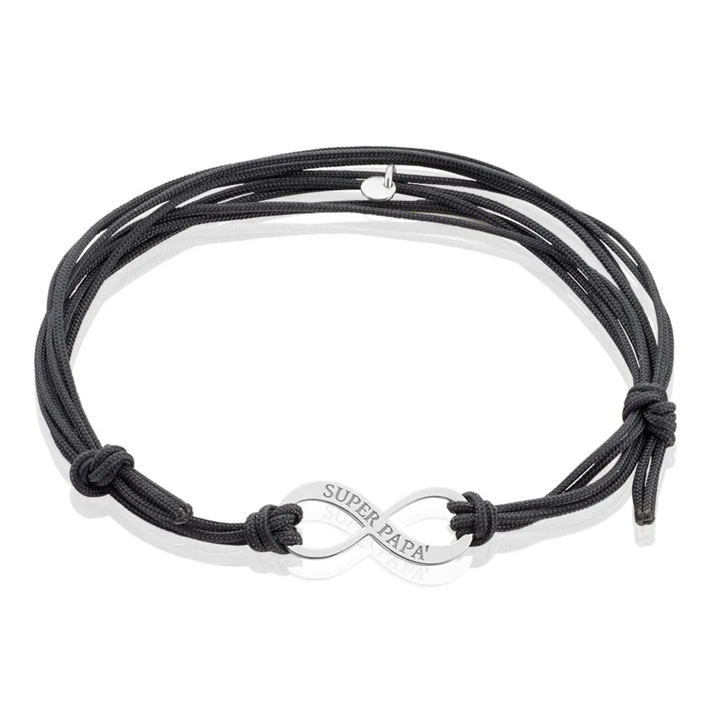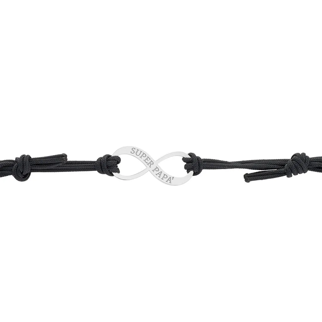 Bracelet Argent Blanc 925/1000 Motif Infini Gravé Super Papa Cordon Noir 19cm