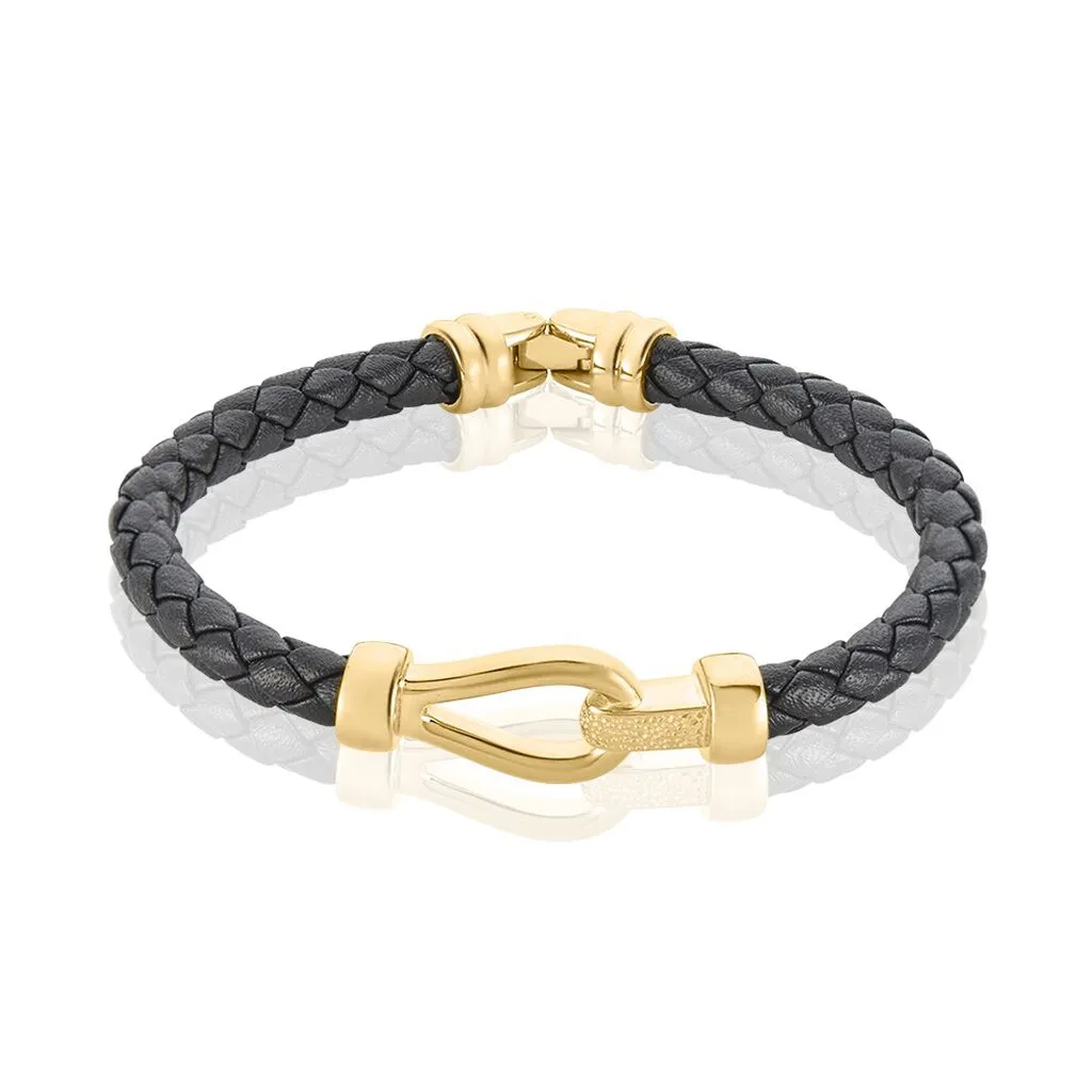 Bracelet Plaque Or Jaune Maillon Cordon Tresse Cuir Noir 21cm