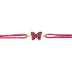 Bracelet Or Jaune 375/1000 Papillon Glitter Fushia Cordon Ajustable Fushia