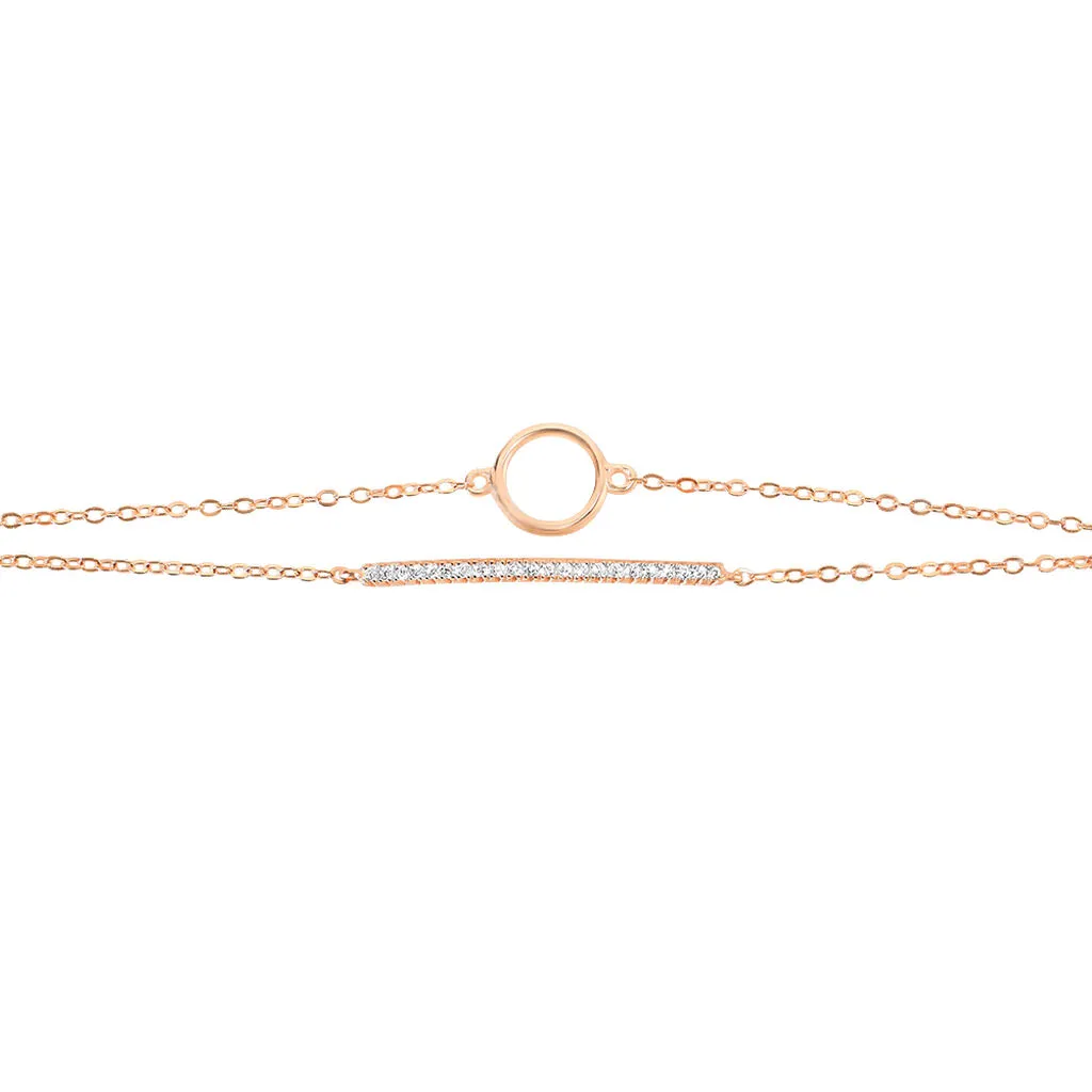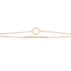 Bracelet Argent Rose 925/1000 Double Chaine Motif Cercle Et Barrette Pavee Oxydes De Zirconium 18cm
