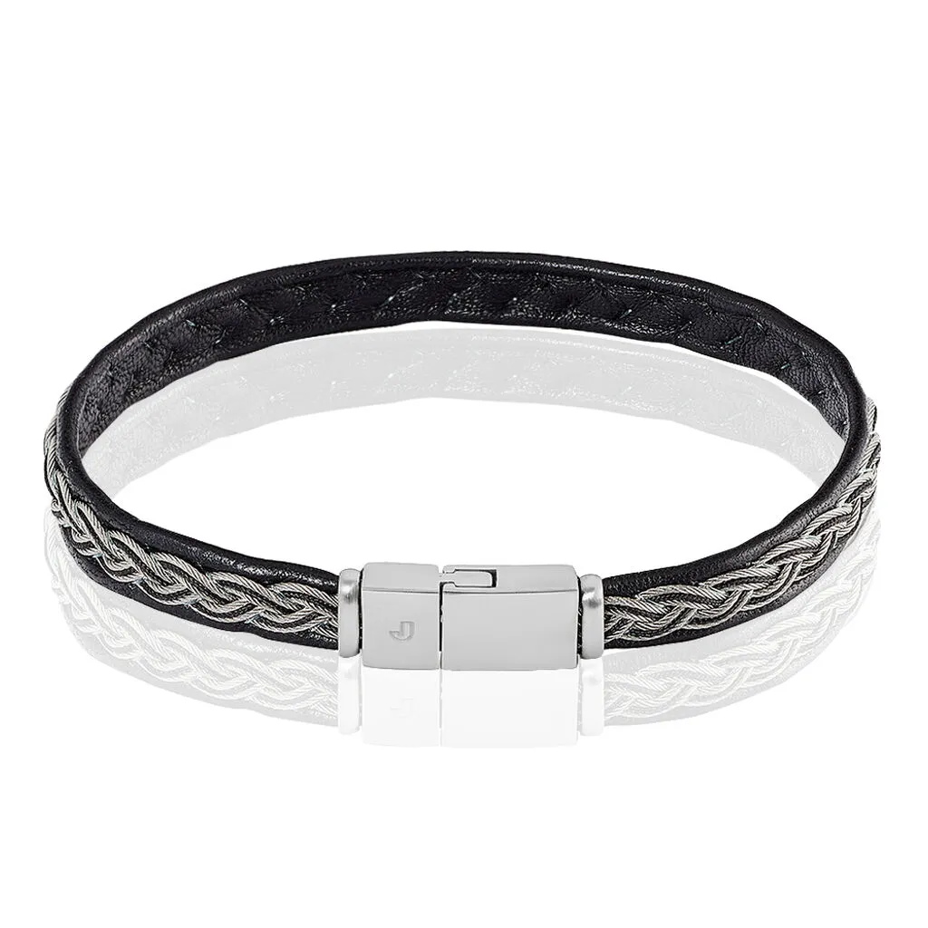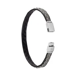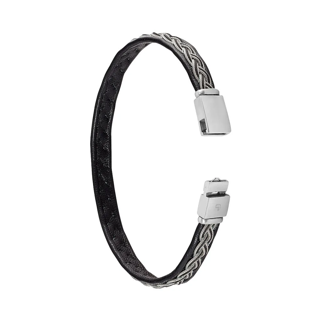 Bracelet Acier Cuir Tresse Cable Et Cordon Noir 21cm